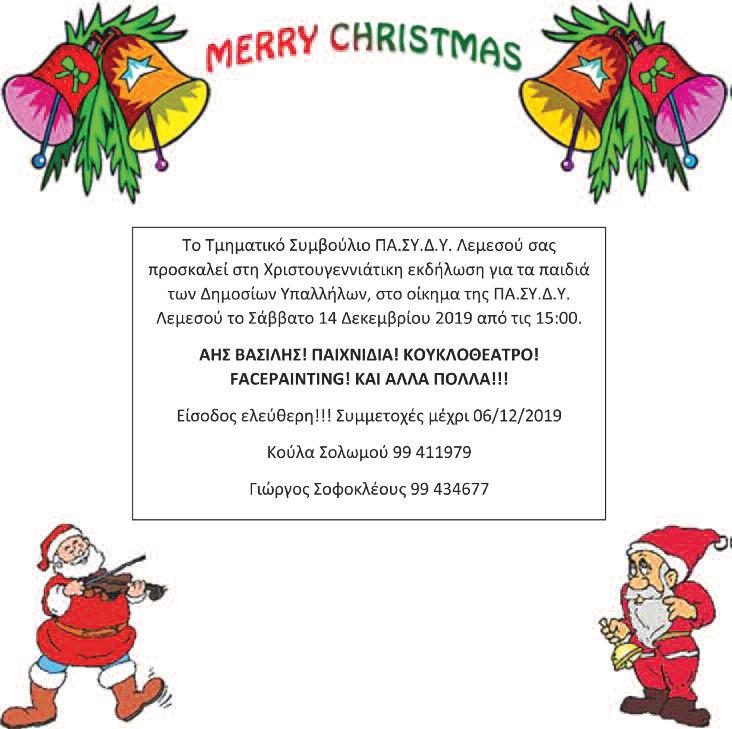 12/14/2019 Χριστουγεννιάτικη παιδική εκδήλωση από το Επαρχιακό Τμ. Λεμεσού Τελευταία Νέα 3/20/2026 Ενημέρωση για το Ομαδικό Σχέδιο Ασφάλισης ΠΑΣΥΔΥ και τις νέες πρόνοιες για τη Φορολόγηση Φυσικών Προσώπων 3/9/2026 Εκδήλωση ΠΑΣΥΔΥ για την Παγκόσμια Μέρα της Γυναίκας 3/9/2026 Ανακοίνωση: Οι Κτηνιατρικές Υπηρεσίες τηρούν πρωτόκολλα 2/10/2026 Ομαδικό Σχέδιο Ασφάλισης Ζωής ΠΑ.ΣΥ.Δ.Υ. 2/3/2026 Ετήσιες Τακτικές Γενικές Συνελεύσεις Κλάδων και Επαρχιακών Τμημάτων Τα νέα του Κλάδου Συνταξιούχων ΠΑ.ΣΥ.Δ.Υ. Μεταρρύθμιση της Δ.Υ. Νέο Σχέδιο Συνταξιοδοτικών Ωφελημάτων-Εγχειρίδιο Εξοχικά Διαμερίσματα ΠΑ.ΣΥ.Δ.Υ.-Κρατήσεις