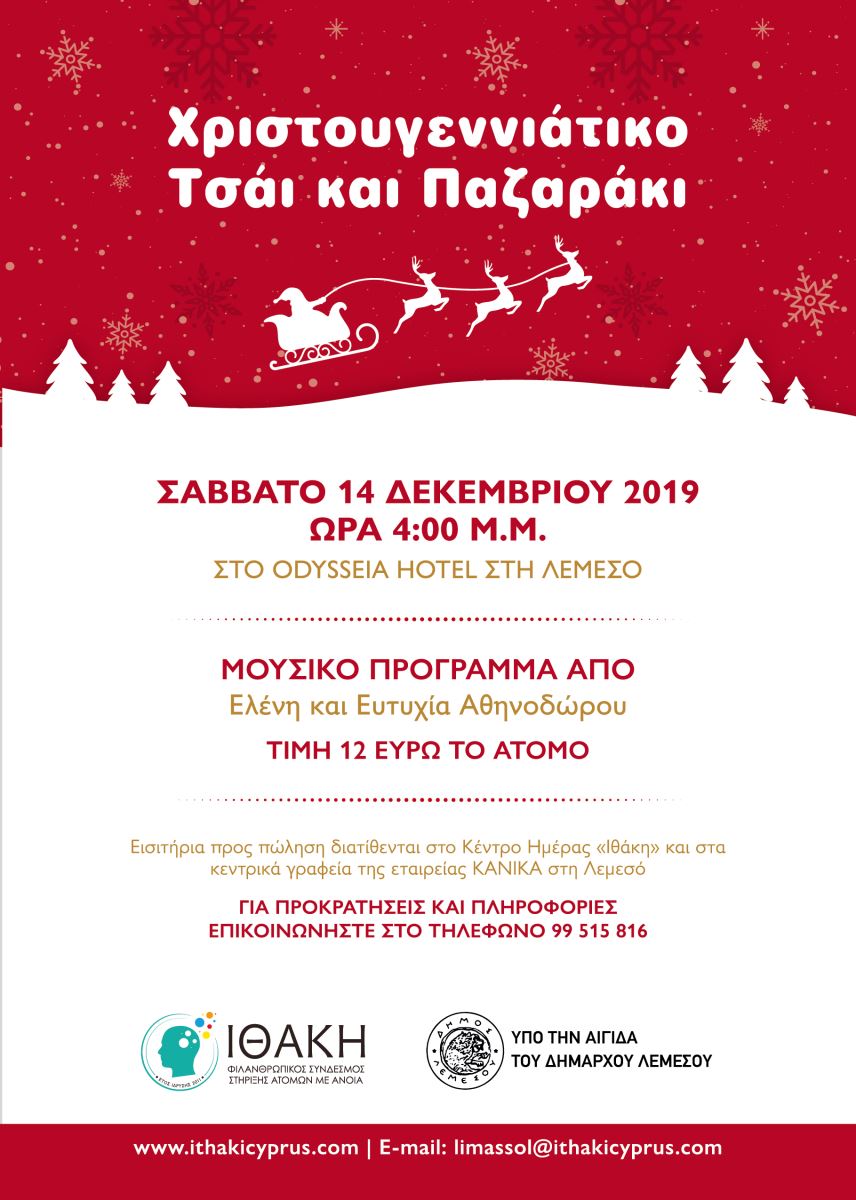 Η Επαρχιακή Επιτροπή Λεμεσού του Συνδέσμου Στήριξης Ατόμων με Άνοια «Ιθάκη» διοργανώνει το καθιερωμένο Χριστουγεννιάτικο Τσάι και Παζαράκι του το Σάββατο, 14 Δεκεμβρίου 2019 και ώρα 4:00μ.μ. στο Odysseia Hotel στη Λεμεσό.