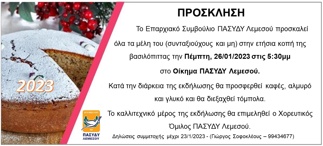 Το Επαρχιακό Συμβούλιο ΠΑΣΥΔΥ Λεμεσού επ’ ευκαιρία του καινούριου έτους προσκαλεί όλα τα μέλη του (συνταξιούχους και μη) στην ετήσια εκδήλωση για κοπή της βασιλόπιττας, η οποία θα πραγματοποιηθεί την Πέμπτη, 26/1/2023 στις 5:30 μ.μ στην αίθουσα εκδηλώσεων «Αμμόχωστος» στο Οίκημα της ΠΑΣΥΔΥ Λεμεσού.